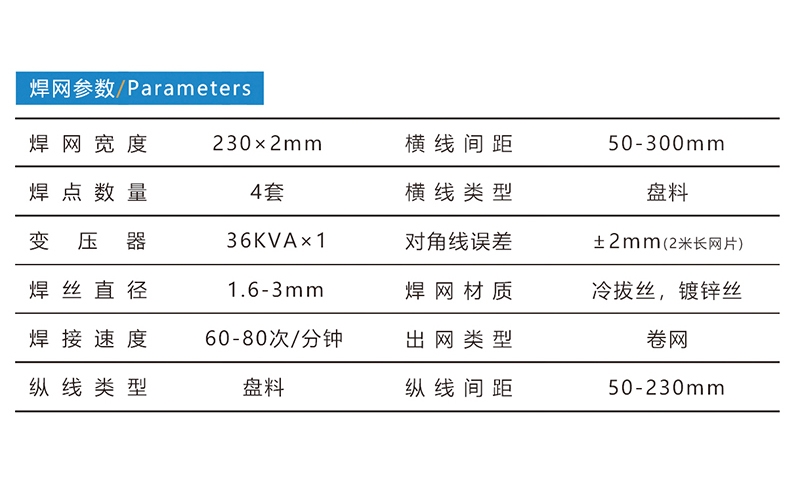 磚帶網(wǎng)焊接生產(chǎn)線,采用盤絲入料,自動(dòng)校直焊接,焊網(wǎng)寬度230mm×2,焊接絲徑1.6-3mm,焊點(diǎn)數(shù)量4套,焊接速度約60-80次/分鐘,出網(wǎng)形式為卷網(wǎng)。標(biāo)準(zhǔn)配置:放線盤、導(dǎo)線架、緩料裝置、縱線橫線校直系統(tǒng)、橫線切斷裝置、伺服送網(wǎng)??蛇x配置:空壓機(jī)。河北驕陽焊工有限公司,0318-7063097