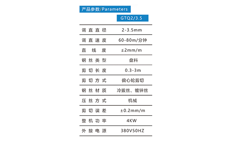 調(diào)直切斷機(jī)GTQ2/3.5,調(diào)直直徑2-3.5mm,調(diào)直速度60-80米/分鐘,偏心輪剪切,剪切長(zhǎng)度0.3-3米??蛇x配置:普通放線盤、制動(dòng)放線盤、動(dòng)力放線盤、上提式放線盤+導(dǎo)線架。河北驕陽(yáng)焊工有限公司,0318-7063097